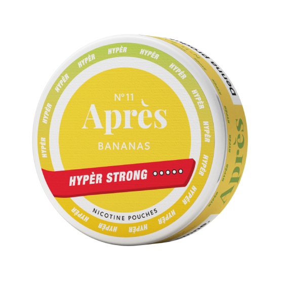 APRÈS Bananas Hypèr Strong är en vit nikotinpåse med smak av banan. Portionerna är helvita och framtagna i Slim-format för en diskret passform under läppen. Varje påse innehåller 11 mg nikotin, vilket motsvarar 20 mg/g, och klassas som en mycket stark nikotinstyrka.