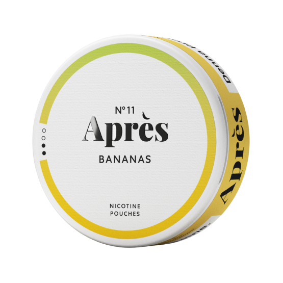 APRÈS Bananas är en vit nikotinpåse med smak av banan. Portionerna är helvita och framtagna i Slim-format för en diskret passform under läppen. Varje påse innehåller 4,4 mg nikotin, vilket motsvarar 8 mg/g, och klassas som en låg nikotinstyrka.