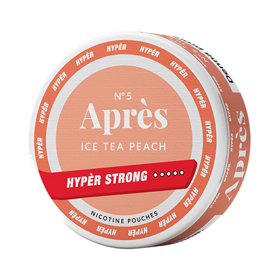 APRÈS Ice Tea Peach Hypèr Strong är en vit nikotinpåse med smak av iste och persika. Portionerna är helvita och framtagna i Slim-format för en diskret passform under läppen. Varje påse innehåller 11 mg nikotin, vilket motsvarar 20 mg/g, och klassas som en mycket stark nikotinstyrka.